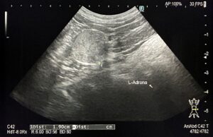 超音波検査:虹彩・毛様体を起源とする腫瘤病変を疑う。下顎および内側咽頭後リンパ節への明らかな転移所見なし。