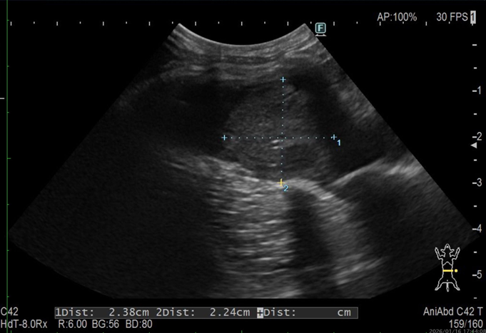 その後胸腔内を超音波で確認していくと前胸部に腫瘤が認められたため、この部分に対して針生検を行った(図2)。