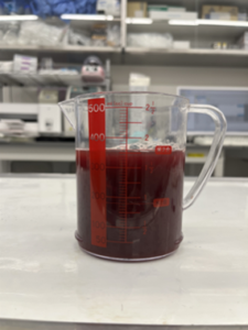 <右>今回来院時の腫瘍:9cmまで増大し、炎症の影響で赤みを帯びていた。一部は皮膚が壊死していた。